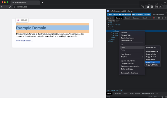 - 브라우저의 개발자 도구에서도 xpath를 복사하는 기능 제공